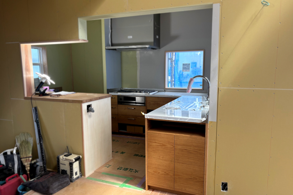 今回はキッチン左の間仕切り壁にステンレスを張っているのですが、今から10年以上前に、同じようにステンレスを壁に張ったお客様のところで、傾けて天板を差し込んだらギリギリ過ぎて壁に張ったステンレスにひっかき傷を作ってしまったことがありまして、慌ててステンレスのタカハシさんに相談したら、急きょ研磨に来てもらったことがあって、急にその時のドキドキした心情を思い出して少し口の中が乾いたのでした。