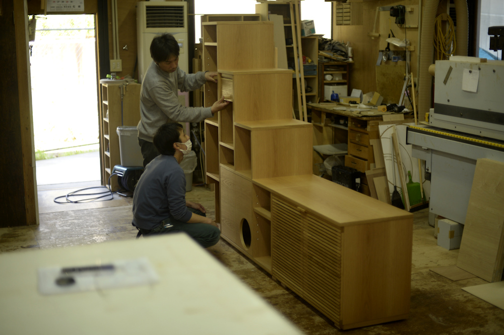 猫階段現る 2026.04.16 昨年の12月22日に打ち合わせにお伺いした「おすそわけ」のIさんの家具がおおよそ組みあがってきました。 蛇腹扉に折れ扉、格子扉に富士山取って。特徴的な形が盛りだくさんのIさんの家具ですが、ヒロセ君がきれいに仕上げてくれました。蛇腹扉や折れ扉の動きを調整して間もなく制作が完了する予定。 はたしてネコさんたちはここで優雅に遊んでくれるのだろうか、楽しみです。