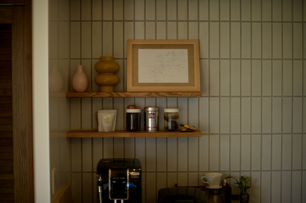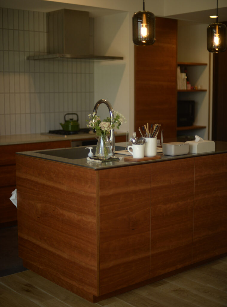 今回はチェリーのオイル塗装をKさんご家族で行なってくださったので、その仕上がりの様子も確認しておきたかったのですが、心配の必要がないくらいきれいな仕上がりになっていました。ざらつきもほとんどなくステンレスもきれいに使ってくださっています。あらためてそのあたりのお手入れ方法の再確認をした後にこうしてキッチンを眺めてみると、やはりチェリーの色の深みが出るのはほかの樹種に比べて早いですね。窓が近いせいもあるのか、だいぶ赤みが増してよい色です。ここにオイルや蜜蝋を時々擦り込んであげるとツヤも増すので、さらに良い表情になるはず。そういう楽しさを見つけながら使っていってもらえたらうれしいです。
