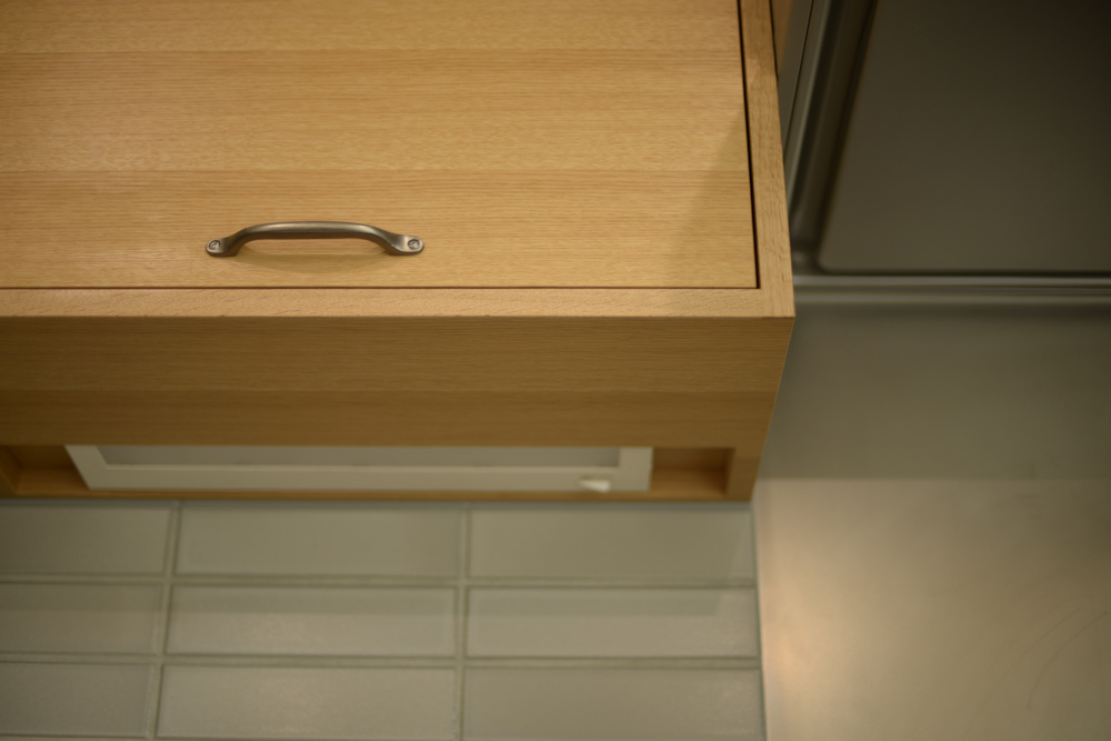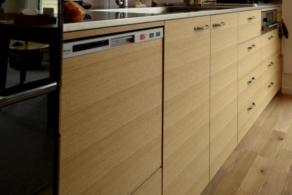 ナラ柾目突板とステンレスバイブレーションの壁付けキッチンと吊戸棚