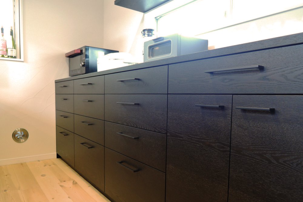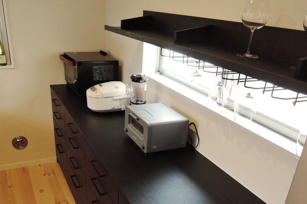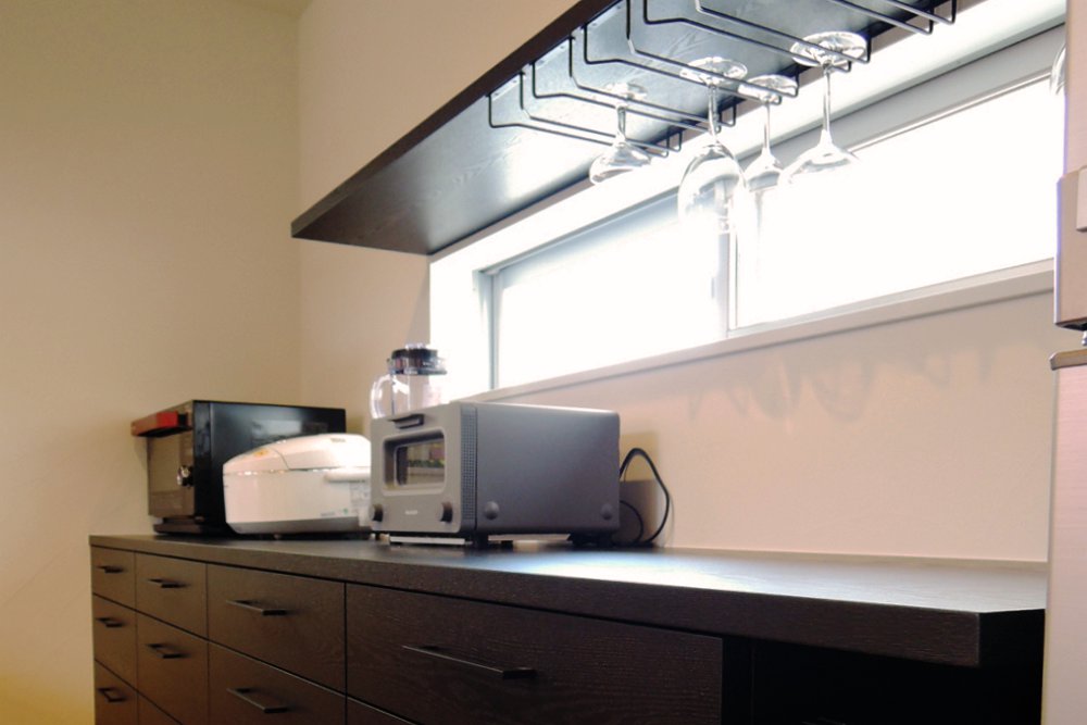 最初は引き出しだけの食器棚だったのですが、お話が進むうちにワインがお好きということが分かって、それならば、とワイングラスやワインが置ける棚も作らせて頂いたのでした。